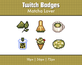 A set of 6 pixel art sub badges for Twitch streamers, matcha themed.
