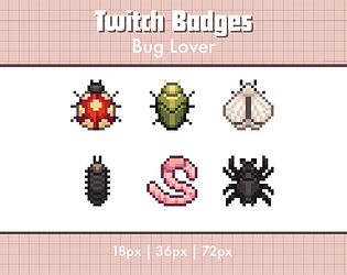 A set of 6 pixel art sub badges for Twitch streamers, bug themed.