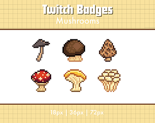 A set of 6 pixel art sub badges for Twitch streamers, mushroom themed.