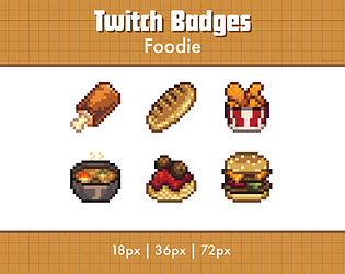 A set of 6 pixel art sub badges for Twitch streamers, food themed.