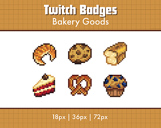 A set of 6 pixel art sub badges for Twitch streamers, bakery themed.