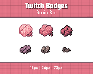 A set of 6 pixel art sub badges for Twitch streamers, brain rot themed.