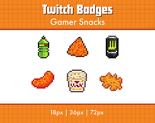 A set of 6 pixel art sub badges for Twitch streamers, gamer snack themed.