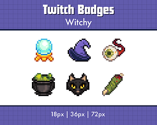 A set of 6 pixel art sub badges for Twitch streamers, witchy themed.