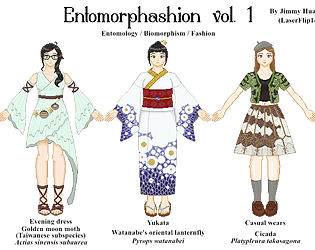 Clothing design concepts inspired by insects, visualized in the form of pixel arts.