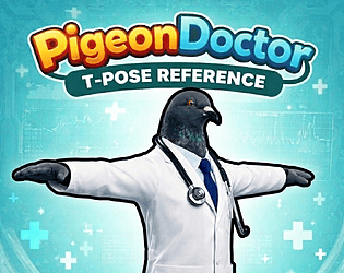 PigeonDoctor T-pose reference sheet with front, side, back, and 3/4 views.