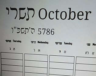 A calendar for Tishrei, of the year 5786. Free and printable, written in Hebrew and English