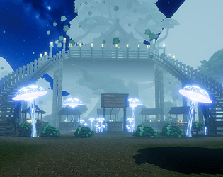 Magical first-person environment set in a glowing forest bazaar.