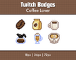 A set of 6 pixel art sub badges for Twitch streamers, coffee themed.
