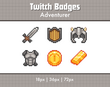 A set of 6 pixel art sub badges for Twitch streamers, adventurer themed.