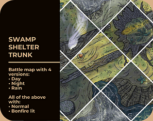 A hand-drawn RPG battlemap of a big tree trunk shelter in the swamp