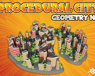 This is a Blender project file with geometry nodes setup to create stylized procedural city