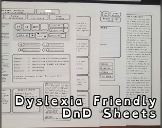 Simplified character sheets for kids, in color or black and white, with explanation page.