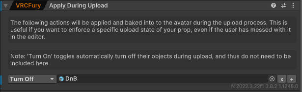 Since the Asset is on when uploading, but the animation is there to turn it off, it will always show for those who do not have your animations on. A simple fix is to add an "Apply During Upload" script from VRCFury on the DnB asset, make it an object toggle, then set the object to the DnB object and set it to turn off.
