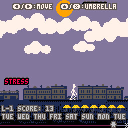I think the changing environment is really clever, because as the stress of life comes down on you, you often forget or "lose sight" of what's around you, and you're left with only your problems. I feel like you could go with that idea even more and apply it to the sounds, i.e. a track that gets more and more intense as you're hit. That way the player feels the stress you're trying to convey even more.