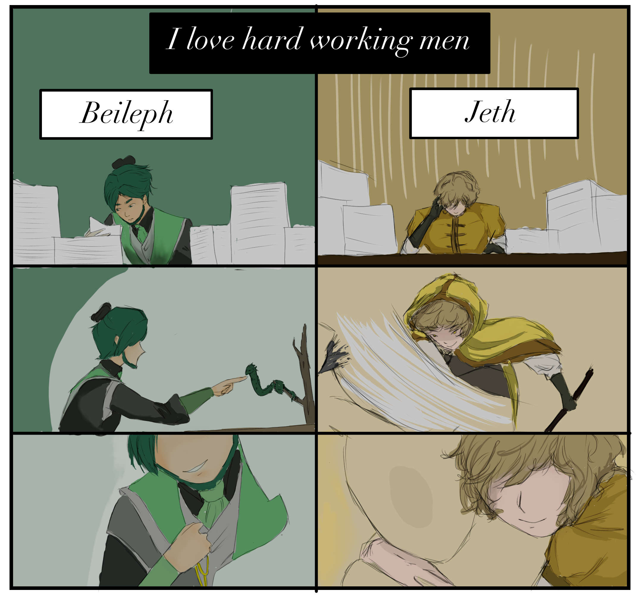 ı kinda think even though they are like super hard working people Beileph's work comes from his passion and he does it because he wants to regardless of what others say while Jeth's job comes more from... essentiality? since he got dragged into this mess from long ago.... (a little spoiler ahem >-<) though ı also think he is capable of getting in the way he wants so calling his job a ''force'' wouldnt be true either ı think XD so Jeth is more like waltzing around people does whatever he should and benefitting what he can without much thinking about ıf he really wants it or not. (ı guess his backgroud story + my these thoughts about him are one of rare reason why ı feel sympathy for him X3)
