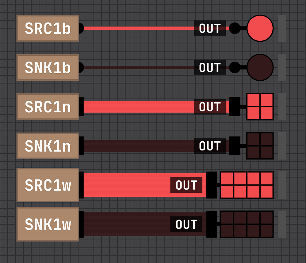 Sources are "always on" and Sinks are "always off" - useful if you need to set a pin to a constant state without needing an external input pin.