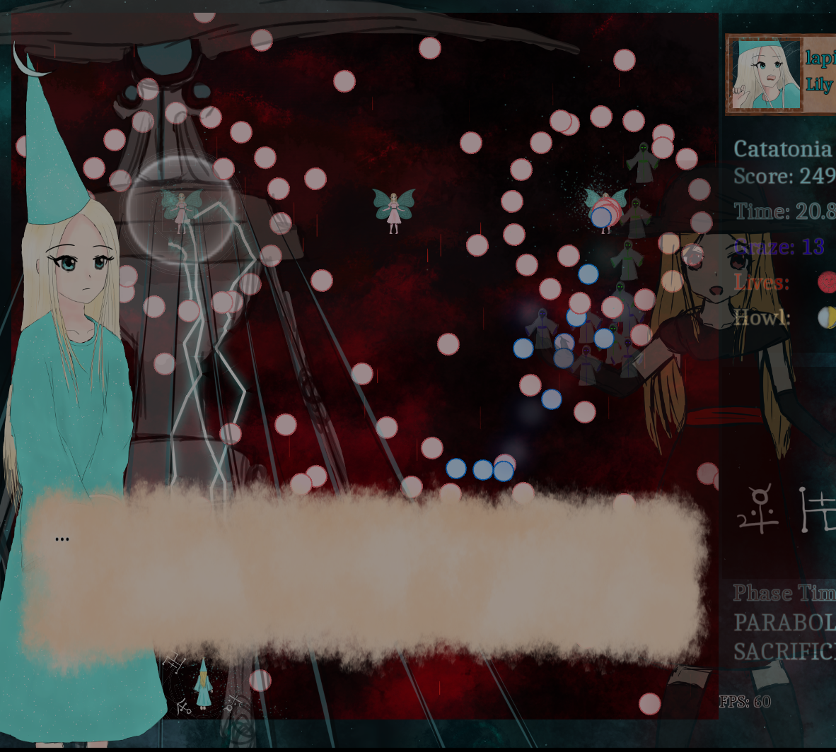 -Got to the vampire(which talks about God for some reason?). The writing feels a little under par, frankly. The boss itself is not great for a first time. The gimmick of bullets suddenly changing trajectory is annoying, and unfair. If they at least slowed down then accelerated, it would be much better than turning on the spot. And, the patterns didn't feel that great, subjectively. Anyways, I died, oops.
