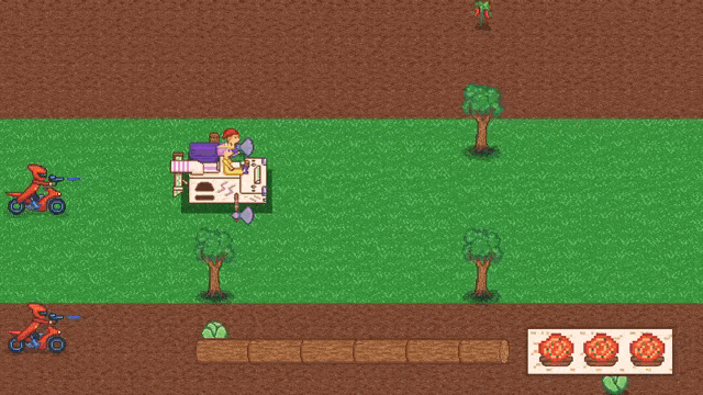 Прикольная игра. Точно есть попадание в тему, вполне неплохо:) Но при ускорении меня прям сильно укачивало, может это только моя проблема ;) Ну и на второй локации, где грядки капусты и ягоды - я сейчас прочитал комменты и понял, но сам я не смог понять как стрелять и бесконечно ехал вперёд. И ты не выигрываешь, видимо надо убить 3х байкеров, но и они тебя не могут победить, т.к. там прям ряд деревьев, и если выбрать положение, то будешь рубить деревья и хилить любой урон, который они наносят. А концепция гонки + сбора ресурсов - прикольная. Очень необычно и свежо :)