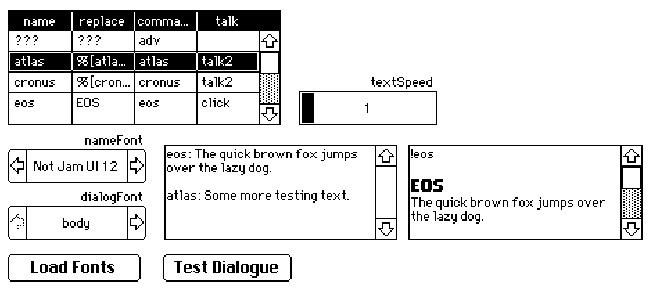 Hehehe this is my first game jam, and my first time using Decker! I love learning new coding languages and pieces of software, so I've basically been spending all my time messing with Lil and dialogizer. Wrote up a text formatter script that will take the stuff from the first text field and turn it into the second field (character name with proper font, and a command for changing the text sounds and such). Not sure how necessary this all is, but it was fun to make hehe. At the very least, it lets me change up the fonts of the dialog whenever I want without needing to go back and edit lots of dialog.