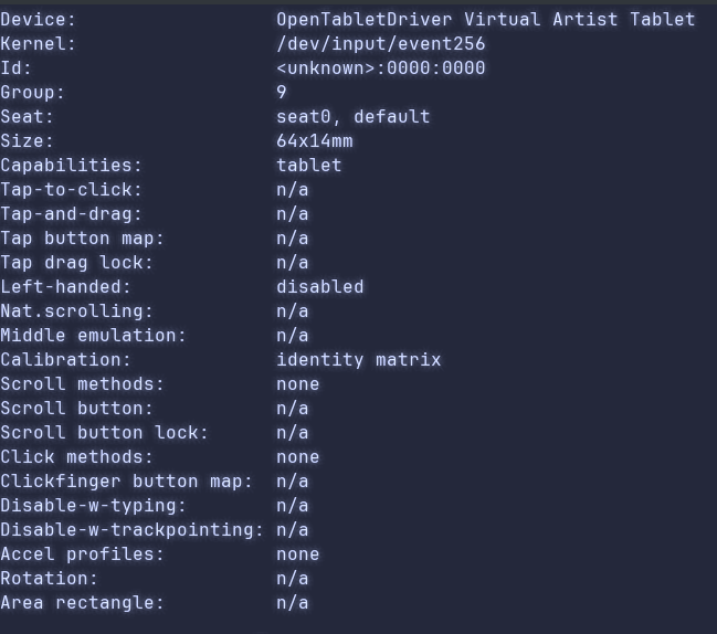 ⎡ Virtual core pointer id=2 [master pointer (3)] ⎜ ↳ OpenTabletDriver Virtual Artist Tablet Pen (0) id=27 [slave pointer (2) ⎣ Virtual core keyboard id=3 [master keyboard (2)] ↳ OpenTabletDriver Virtual Artist Tablet id=26 [slave keyboard (3)]