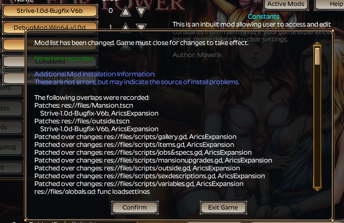 oh that explains it! i didn't realize that's how debug mode worked ^^' unselected it in the mod menu + put it in the right spot and everything's working fine now! my guess is the first go around was the aricsexpansion-main issue and then i was a dunderhead with debug mode, thank you so much! (misunderstood the ingame instructions of debug as it not being visible right away/in the mod menu, not that it wouldn't be in the mod folder until i looked at the txt file)