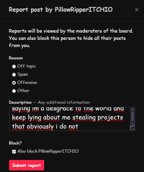 You stole my project. You deleted the thread where me and someone else asked you about it. You take credit for my work. You say that I stole from you. If I didn't make the grand decision to update my game frequently and add watermarks everywhere- you could've ruined my reputation for your own well-being. PillowRipper tried to lightly ask you about this and gently confront you. You turned to threats and harrassment. PillowRipper and I have reported you already for your harrassment and theft- I don't expect anything to happen though. You reported PillowRipper for no reason. Twice. Again, for NO valid reason. Genuinely? It's pissing me (and others) off a lot. Loxbiruta, Grow up.