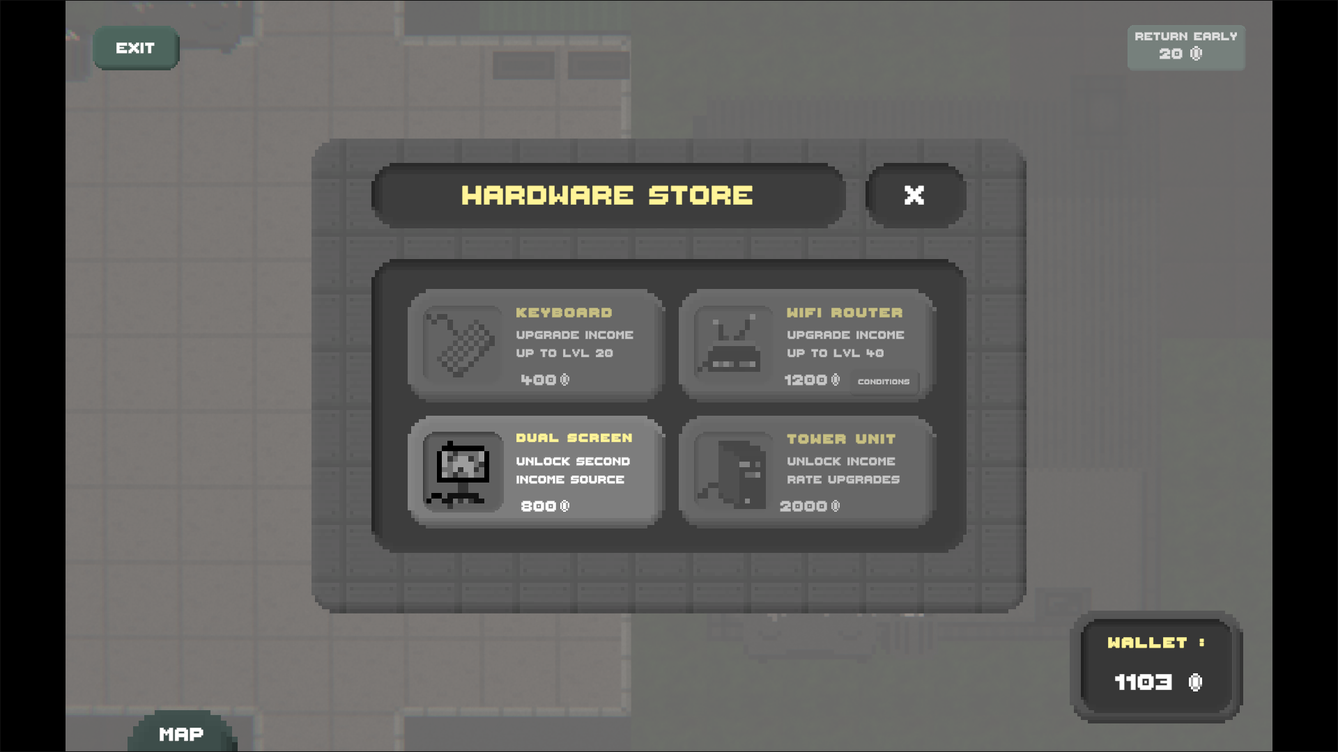 The mechanics here work really well even if they are tedious (which is the point) and the brown-tinted pixel art adds a lot to the atmosphere.
