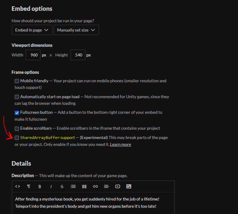 Heya not sure if this will fix it, but have you tried enabling SharedArrayBuffer support in the game's itchio settings? The setting is just above where you add the description for your game.