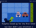 Nooo poor ralphie. Was a bit confused by the last level but managed to figure out a workable solution in the end! I like the message of the game and the art style as well. I like the Ben AI it was fun to figure out how to get him to do stuff. Overall a interesting concept and a fun game! Great work!