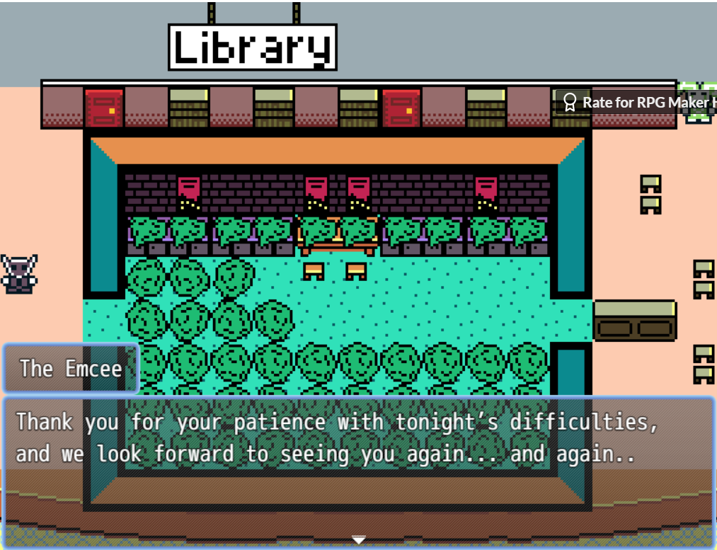 Very nice usage of 8 bit graphics along with the chiptune audio, I really like how the game is presented. What would have made it better would have been to change the default windowskin and font to something a little more pixelated, it kind of clashed with the visual aesthetic you were going for, especially in a text heavy game like this.