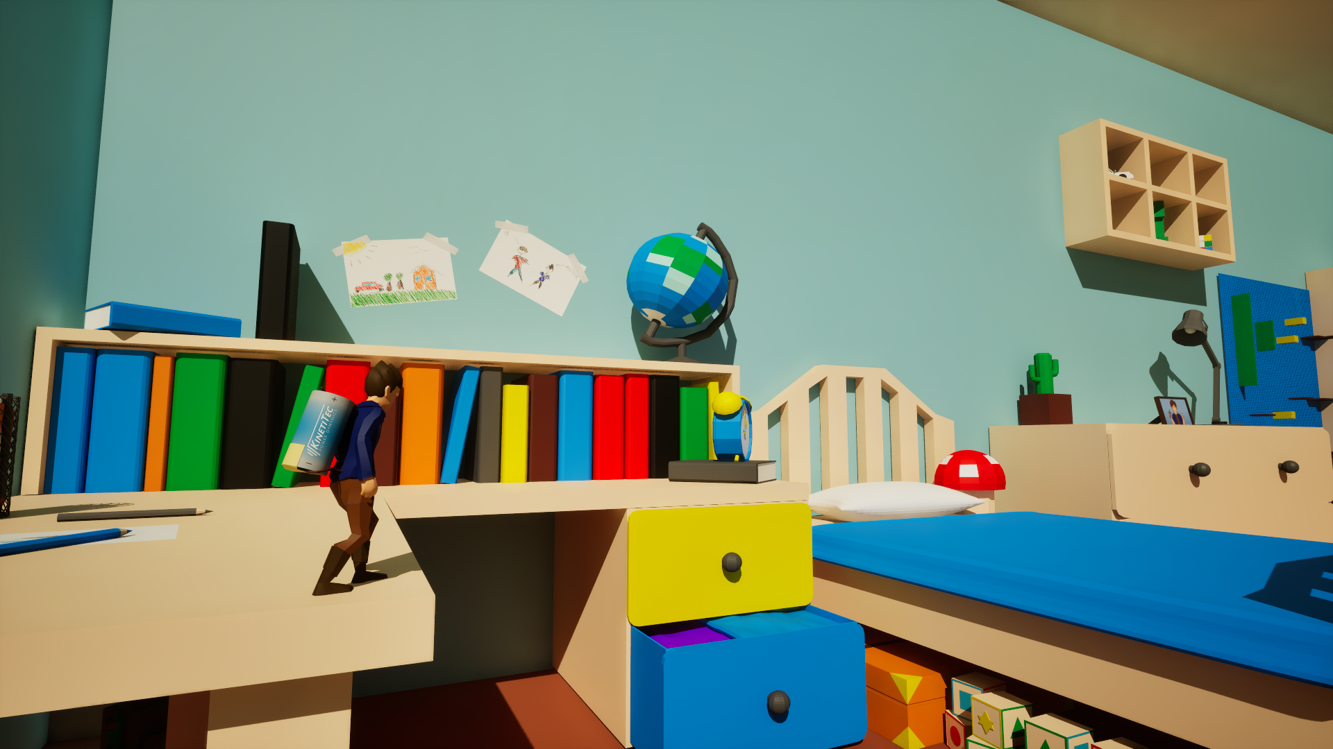 During the journey, the protagonist faces various challenges that require both dexterity and cunning. He traverses a cluttered garage, climbing a tool net and squeezing through the ventilation. In the garden, he sneaks after a dangerous rat and avoids the sight of the boy's father looking through the window. In the child's room, he moves around a maquette of a city full of enemy toys and controls a remote-controlled truck to reach a photo that will remind the boy of his old toy.
