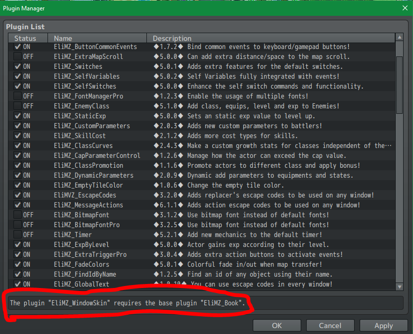 Now, all my plugins need the Eli Book. And if you are not using it, besides the error in game, the RPG Maker plugin manager window will show you a warning on the bottom of the window: