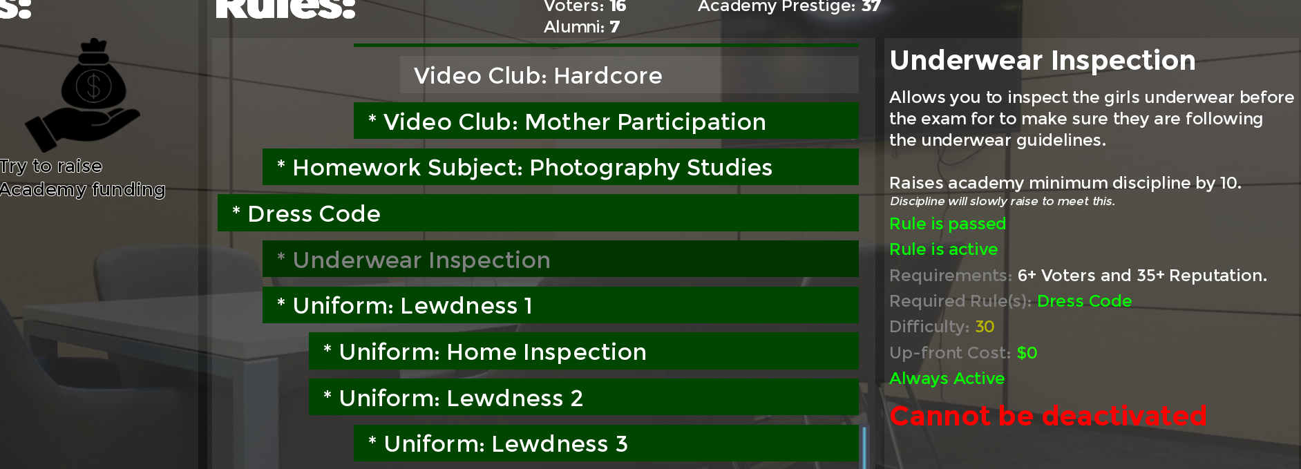 You need to also go to the computer -> management and set a uniform for the students. Previously the rules set what girls can wear but now you can pick the items yourself.