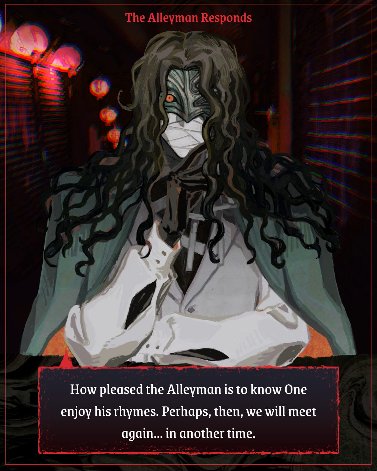 I love the Alleyman's poetic prose and the way they rhyme a lot, it really sets the tone that whoever this is, they are someone to not be trifled with. The gamble itself was really well executed, and it had me needing to strategise a little in order to win. I had fun playing this!