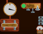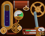 The second page has a lever, a pressure bar and three sets of lamp, gauge and toggle. Pull the lever when the engine has started to start this component as well, the levels on the gauges should start moving. Pressing the toggles causes their connected gauges to flip direction. When the gauge (and lamp) shows red, pressure builds up in the left bar. Flip the gauge direction to stop the pressure from rising and pull the lever again to lower the pressure level. If pressure reaches the top, the engine will stop. As long as the lamps are green you will recieve extra speed.
