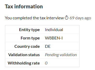 I've been waiting for about 69 days now on the validation of my tax information. It says that I've "completed the tax interview", but the validation status is still pending after over 2 months now. To the best of my knowledge I've correctly filled out the tax information. Yet, I've not gotten any feedback yet (nor can I resubmit the tax information if that's somehow faulty). I've also written the support team (ticket #290828) on the 12.07.2025 and haven't gotten any response yet; and it'll soon be almost 2 weeks without any support feedback.