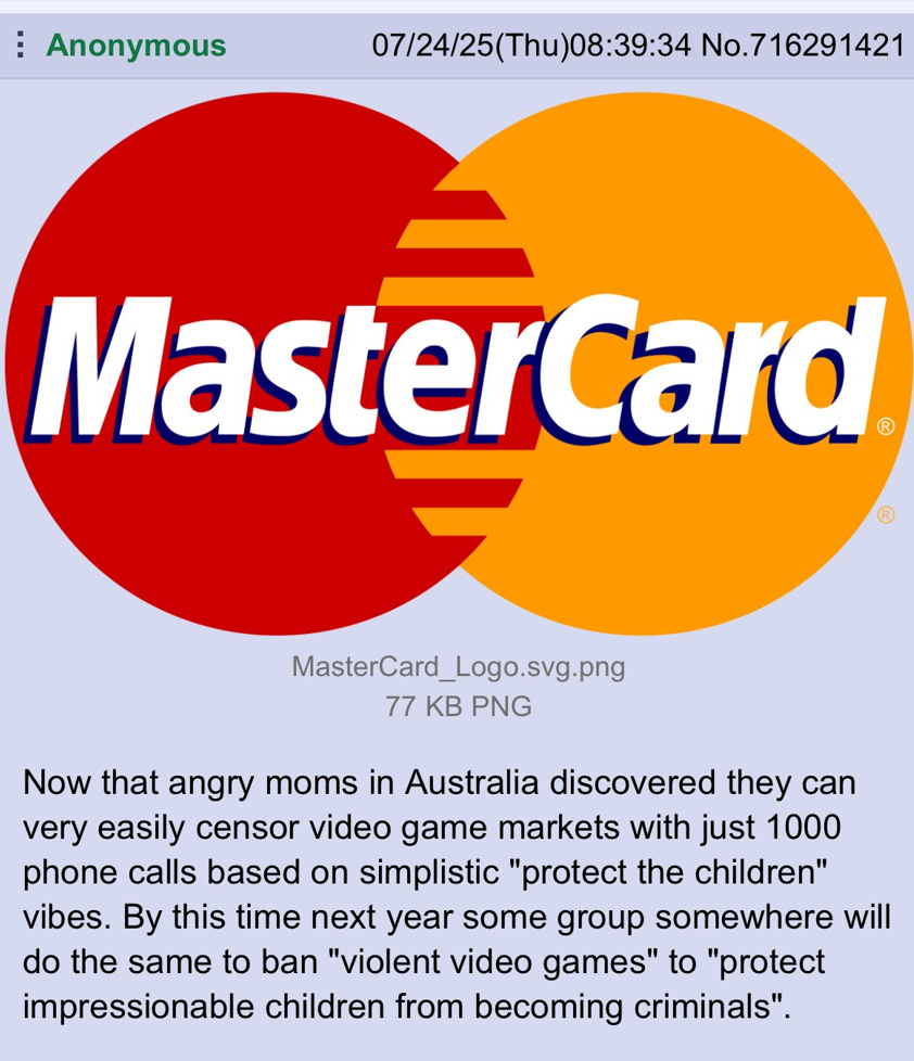 Nevertheless Mastercard/Visa (plus other payment processors) and The Collective Shout should not be in control of what we can spend our money on and what can be sold on the market!