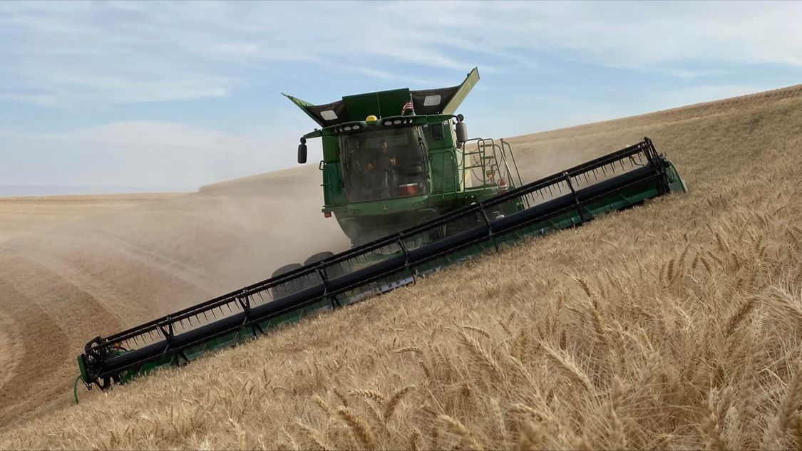 This looks like the palouse hills in se washington state where i grew up. i didnt know they made flat land combines because all they used there was auto level jd case and a a couple people used gleaners