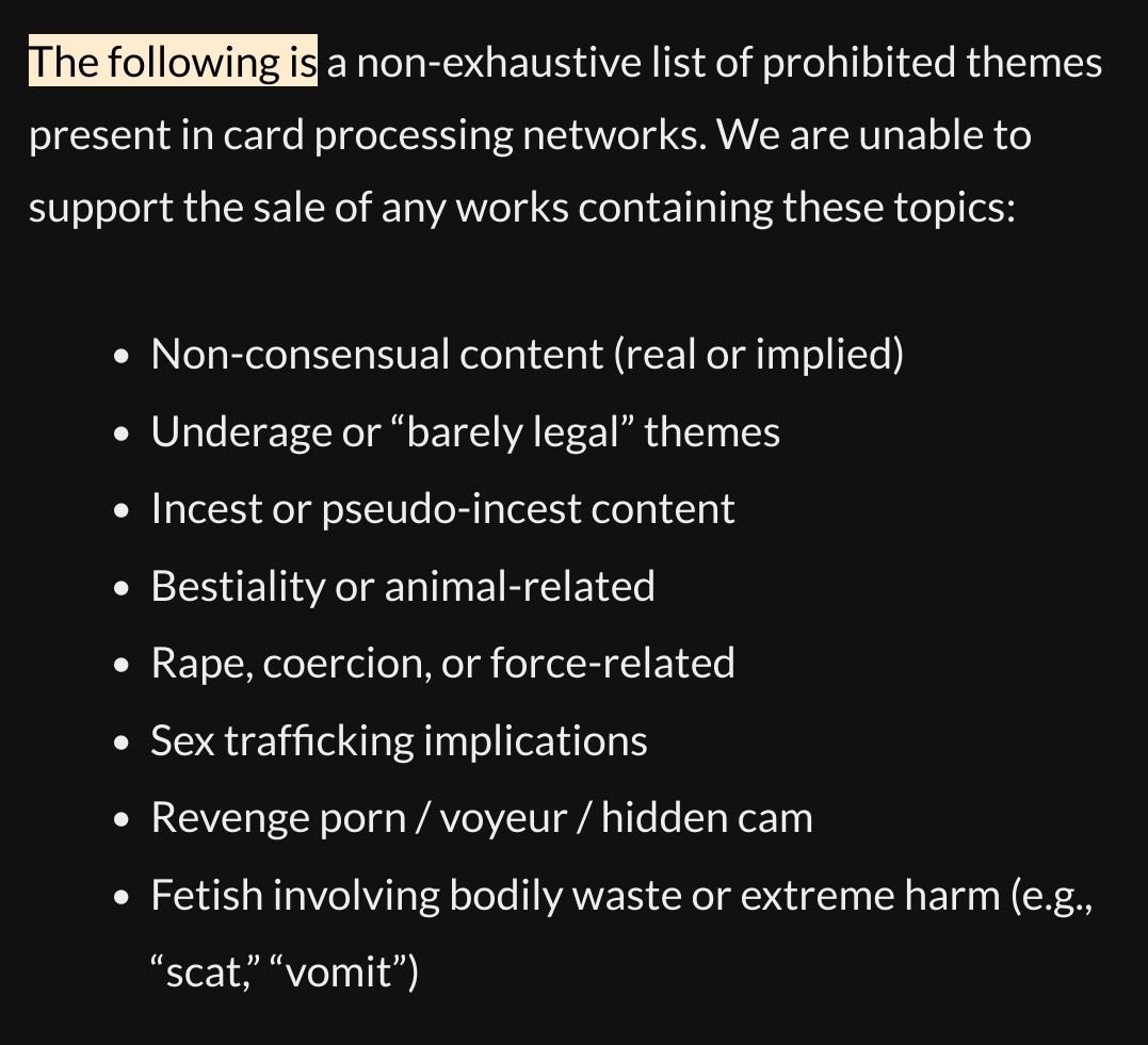 But indeed, I can’t deny itch has been overzealous (or perhaps the payment processors had stricter expectations than Collective Shout pretends to have). Itch made a list of the topics they don’t tolerate on the platform, and it is as follows: