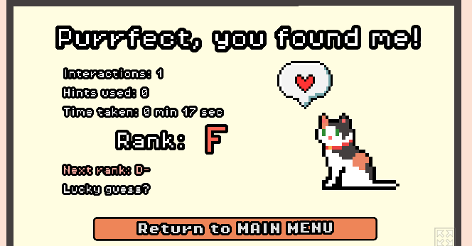 On my first game I picked up the wet food and tried it on cat 1 and he loved it. I was like "Oh ok so multiple cats are going to love it" So I tried it on the other 9 and they hated it. So then I claimed cat 1 and I got a B- after 10 interactions. On the next game I checked the mixed food, and cat 1 liked it again, so I just claimed it right away and I got a worse score for a better time and less interactions? huh??