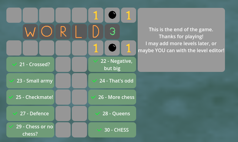 Very nice. I liked the incorporation of other board games. Difficulty curve was perfect. I don't have much more to say. Maybe add a GO piece where it flips from black to white depending on the number thats under it?