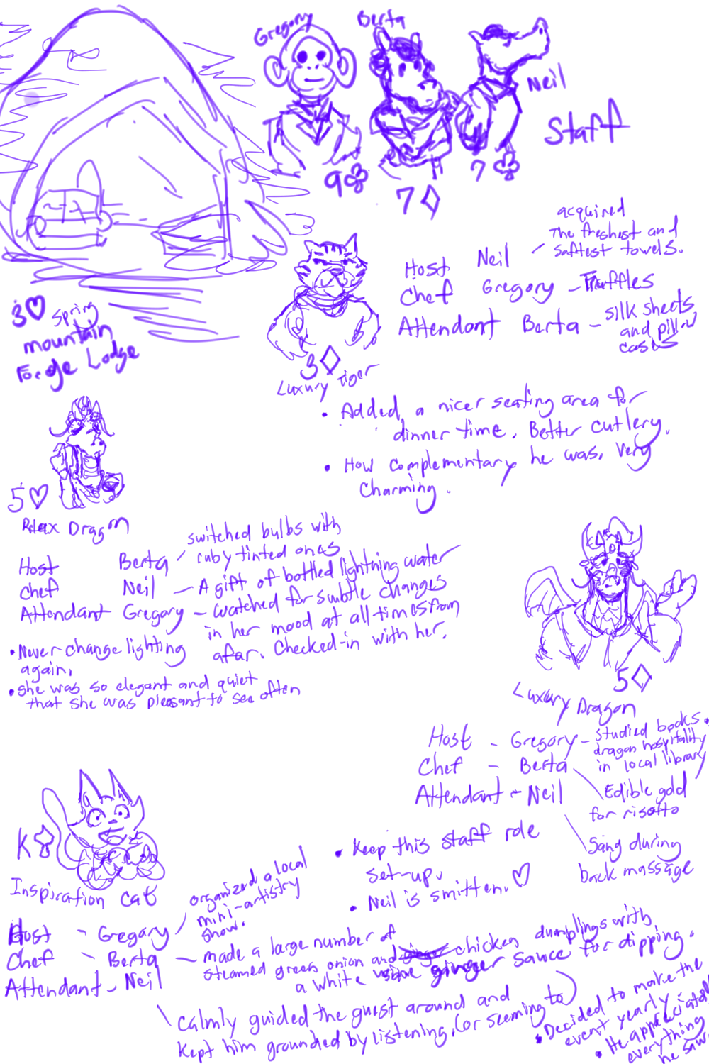 I realize you have so few examples of people playing in an almost actual-play-way. My goal, playing this as a doodle sketch game, was not to linger on the art or words. Just be quick and focus on the game (which makes this great for art warm-ups). So you can see the original doodles that informed the artwork with Gregory, Berta, and Neil. The guests all have names too, but I had to stop myself from drawing a mini-zine about the game and playthrough. I enjoyed it that much.
