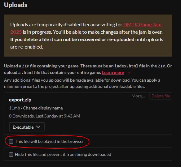 Did you delete the game during the jam or just did not make it in time to upload game files? Since when I opened your game page, there was no game files, just "developer hasn't uploaded any files yet".
