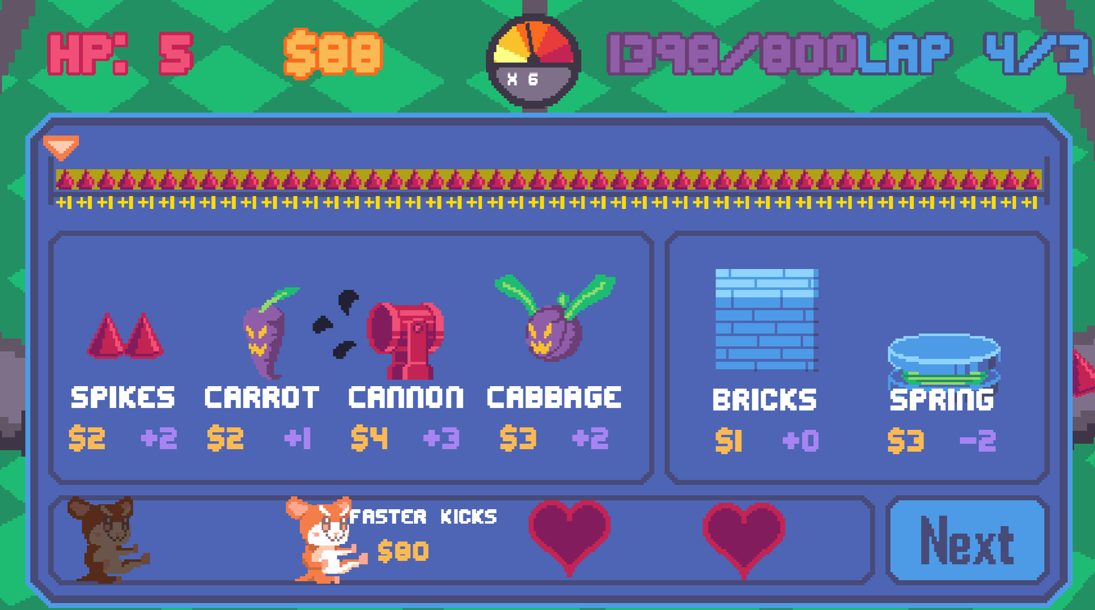 Regarding it as a game jam game, I think the initial score requirement of 100 is way too high. I tried like 8 runs playing "normally", building tricky courses but still couldn't get 100 at all. Then I just thought about and spammed Spikes, and the game became trivial. I get that balancing is hard in a jam game, but good job overall.