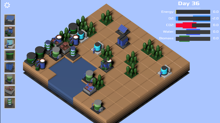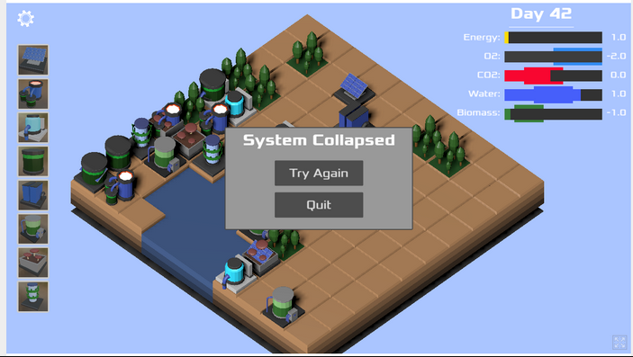 i think i had all values near ideal levels so everything was a'okay until the balance gave out, i was unsure though of what constituted a 'collapsed system' and what resulted in the 'game over' at the end. i think that communicating target levels more clearly and, in the event of a game over, reporting the reasons for it (i.e. "your CO2 was too high") would help the player a lot!