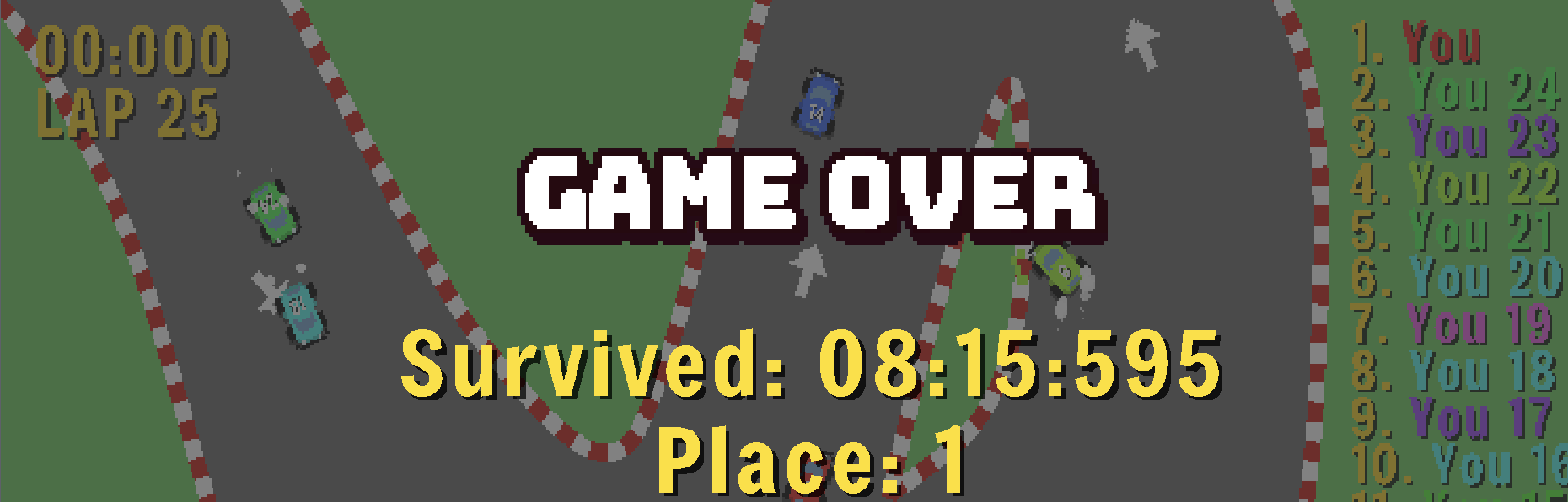 A really fun game, t'was a bit of a marathon, but I thoroughly enjoyed the timing system and previous attempts becoming road obstacles. Bounced into a lot of walls, but I eventually started to wrap my head around the car controller system and locked in. Felt like the car controller was very close to being perfect, too. It was tricky enough to cause chaos without being impossible to control! Lovely game <3