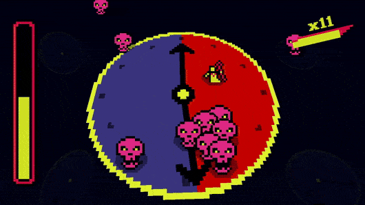 Really unique gameplay. The two clock hands interacting while spinning make it tricky to master. I like the balance between losing and gaining health. I wish the kill button had a shorter cooldown but maybe it would be too OP. Awesome game!