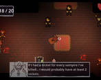 Snappy gameplay, energetic and spooky music, clean and emotive art! Presentation wise I really liked this. And the protagonist's scatterbrained remarks as he shreds through vampires were funny. And I like the funky collectible art, especially that one. You know the one.