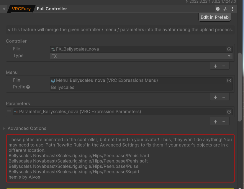 The asset paths error shows up on the prefab before and after I apply it to the avatar hierarchy. I will need a guide on what steps to take to properly apply the prefab. When I attach it to the hierarchy itself instead of attaching to a specific part, the scales and junk show up on the floor behind the tail. It does show it being linked to the hips for VRCFury, though I am not sure if that means anything
